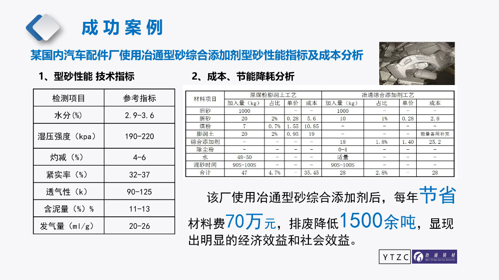 成功案例精選:某國內汽車配件廠使用冶通型砂綜合添加劑型砂性能顯著提高,每年節省材料費70萬元,排廢降低1500余噸,顯現出明顯的經濟效益和社會效益。