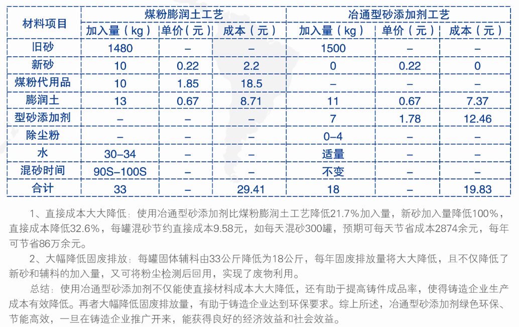 直接成本大大降低,使用冶通砂型添加劑比煤粉膨潤(rùn)土工藝降低21.7%加入量,新砂加入量降低100%,直接成本降低32.6%,每罐混砂節(jié)約直接成本9.58元,如每天混砂300罐,預(yù)期可每天節(jié)約成本2874元,每年可節(jié)省86萬(wàn)余元。